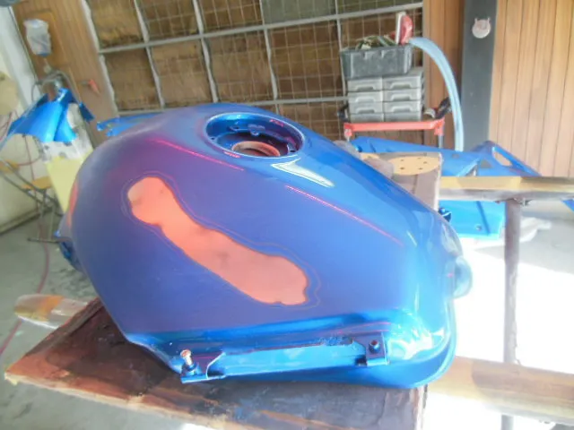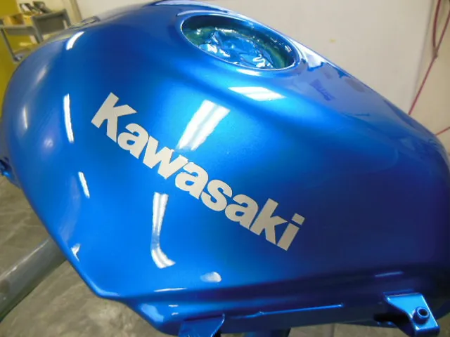 バイクの色は車と違って、キャンディやカラークリヤなどちょっと難しい色が多いです。それでもハイカラヤならこのとおり。新車のように再現できますよ。