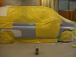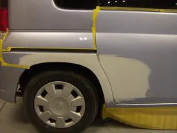 板金が終わり、サフェーサーという下地を塗ったところ。