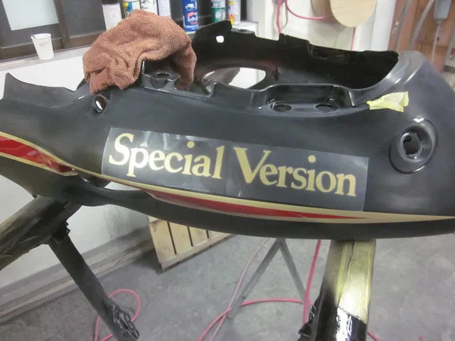 ラインやデカールの段差を落して滑らかになったら、サフェーサーを入れます。今回はブラック系なので、サフェーサーも黒。